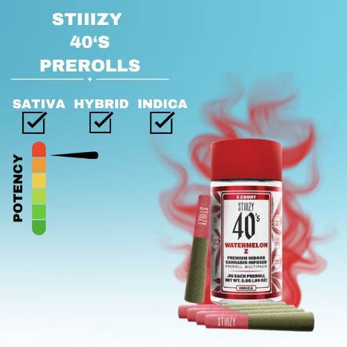 | Stiiizy 40's Prerolls | King Louis XIII (Indica), Orange Sunset (Sativa), Pink Acai (Hybrid), Purple Punch (Indica), Strawberry Cough (Sativa), Watermelon Z (Indica) |
